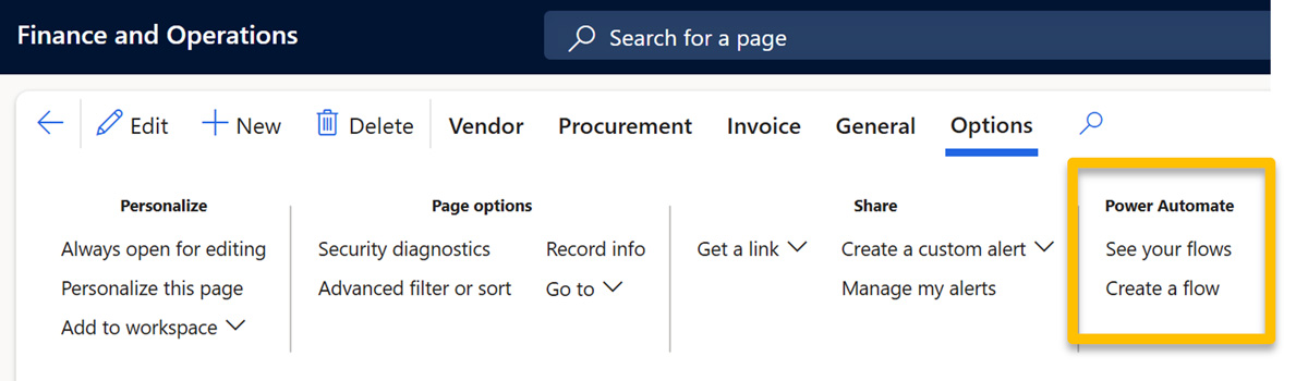By enabling the Power Automate Options Action Menu Items feature in the Dynamics 365 Finance Feature Management workspace, Power Automate will become easily accessible directly in the taskbar under the Options tab across the system.
